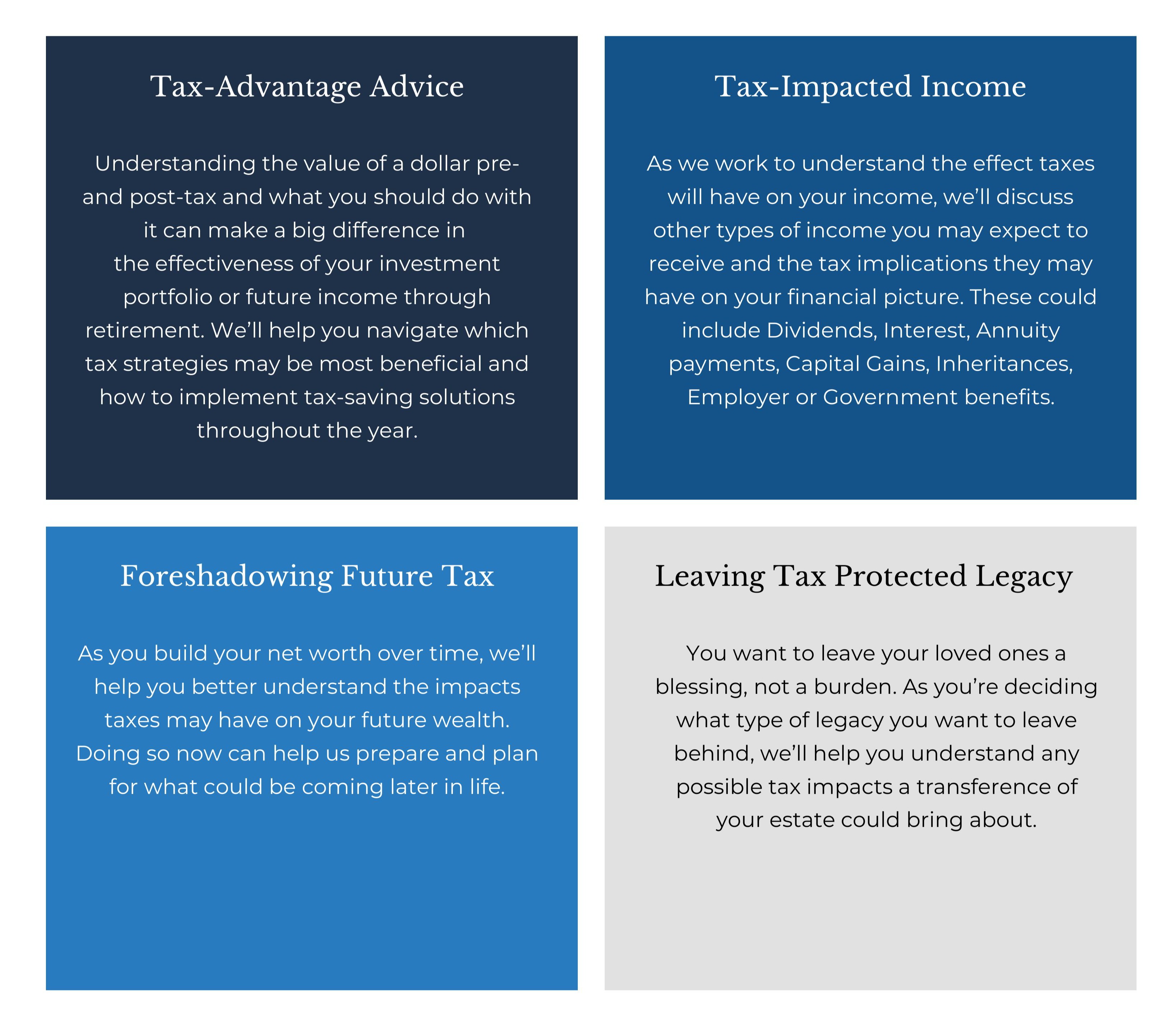 We aren’t here to help you avoid taxes, but rather develop a structure in your finances that reduces the burden of your tax liability year-after-year.